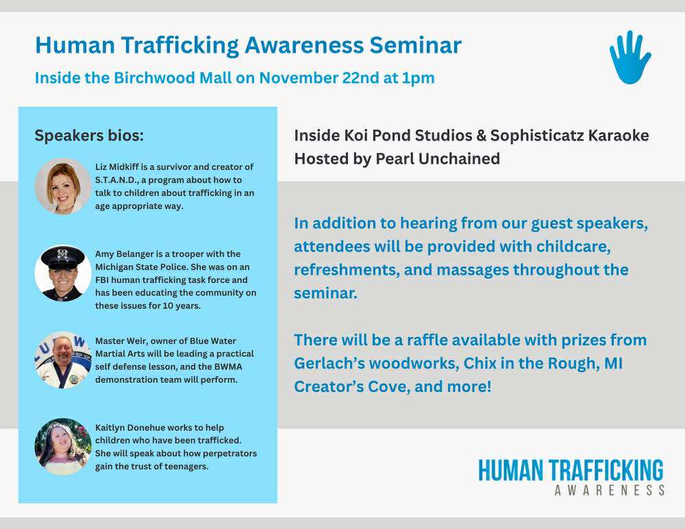 The Human Trafficking Awareness Seminar will be hosted by Pearl Unchained, and the seminar will take place in the Sophisticatz Karaoke Venue, located in Birchwood Mall, on November 22nd at 1pm to 4pm! This is a free event and open to the public! There will be speakers, and a self-defense demonstration.