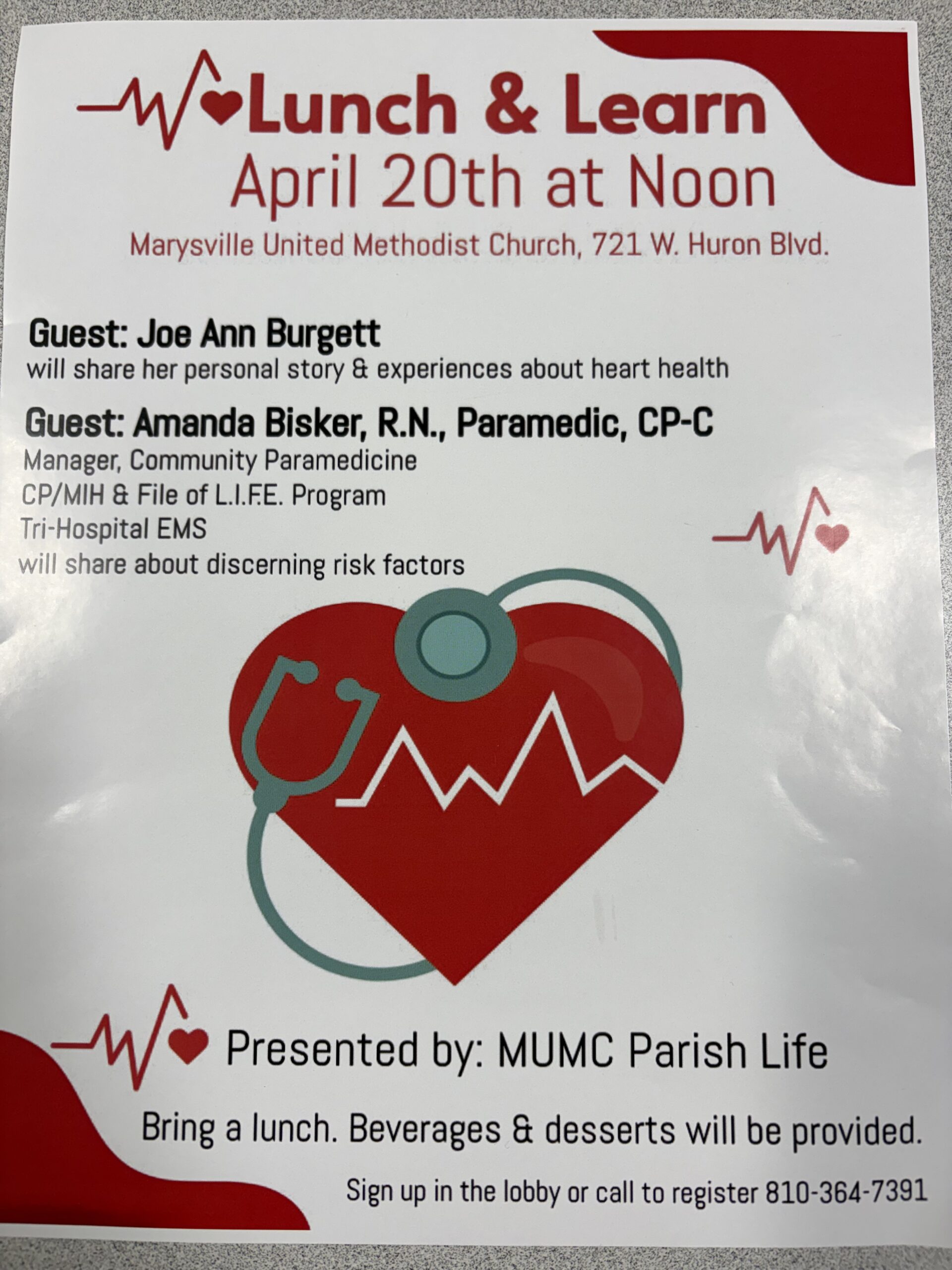 Marysville United Methodist Church Parish Life will present a Lunch and Learn Heart Health presentation on April 20th at noon at the church. Joe Ann Burgett will share her personal story and experiences about heart health. Amanda Bisker RN, Paramedic, CP-C will share about discerning risk factors. Bring you own lunch…beverages and desserts will be provided. Register by calling 810-364-7391.