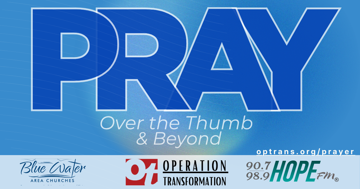Operation Transformation and our partners HopeFM and Blue Water Area Churches are excited to invite you to come together in prayer for Michigan’s Thumb & Beyond. As individuals and groups pray over neighborhoods, schools, workplaces, community spaces, and more, those prayers will be reflected on the interactive map displayed on the Operation Transformation website. https://www.optrans.org/prayer (The map is updated weekly).
