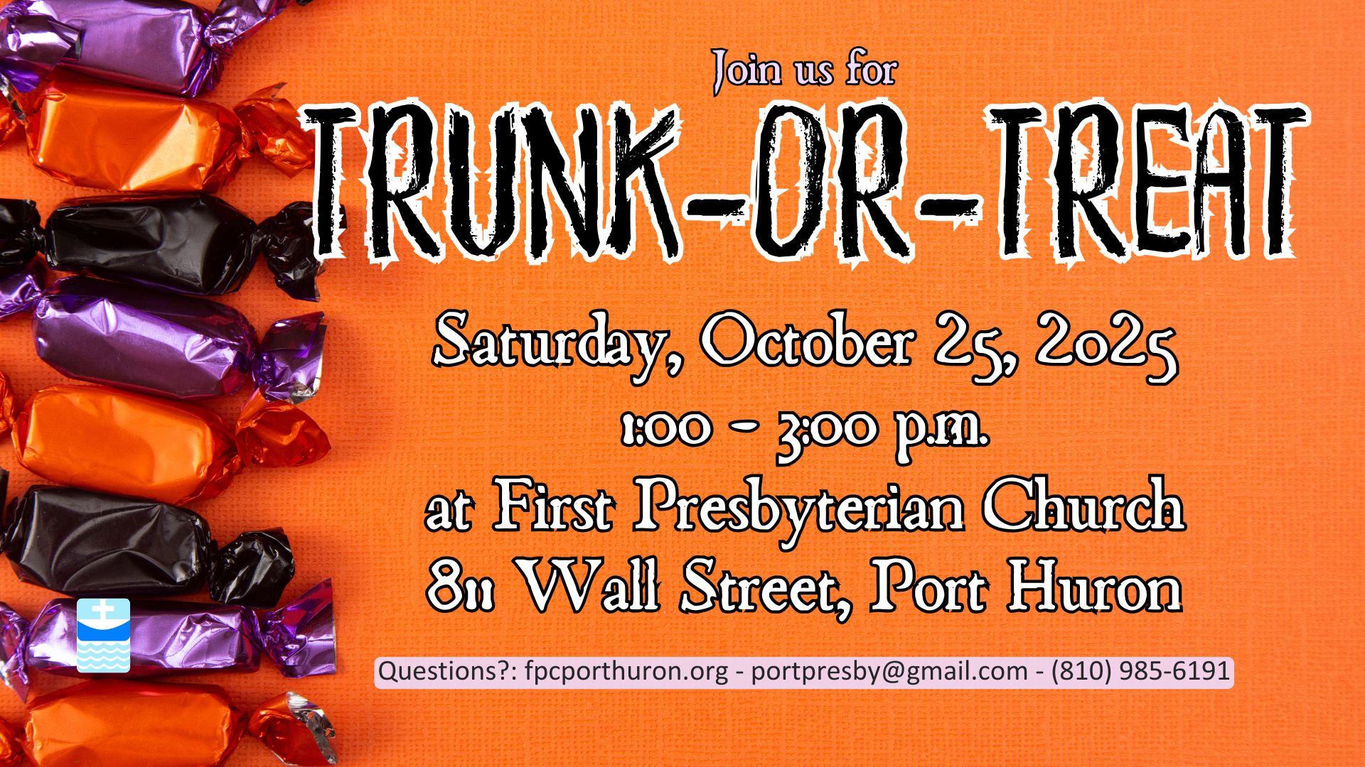 Bring your friends and family, dress up in your favorite costume, and collect some candy at First Presbyterian Church of Port Huron, located at 811 Wall Street during their trunk-or-treat on Saturday, October 25th from 1:00-3:00 p.m. If you have any questions, please contact the church at (810) 985-6191 or portpresby@gmail.com.