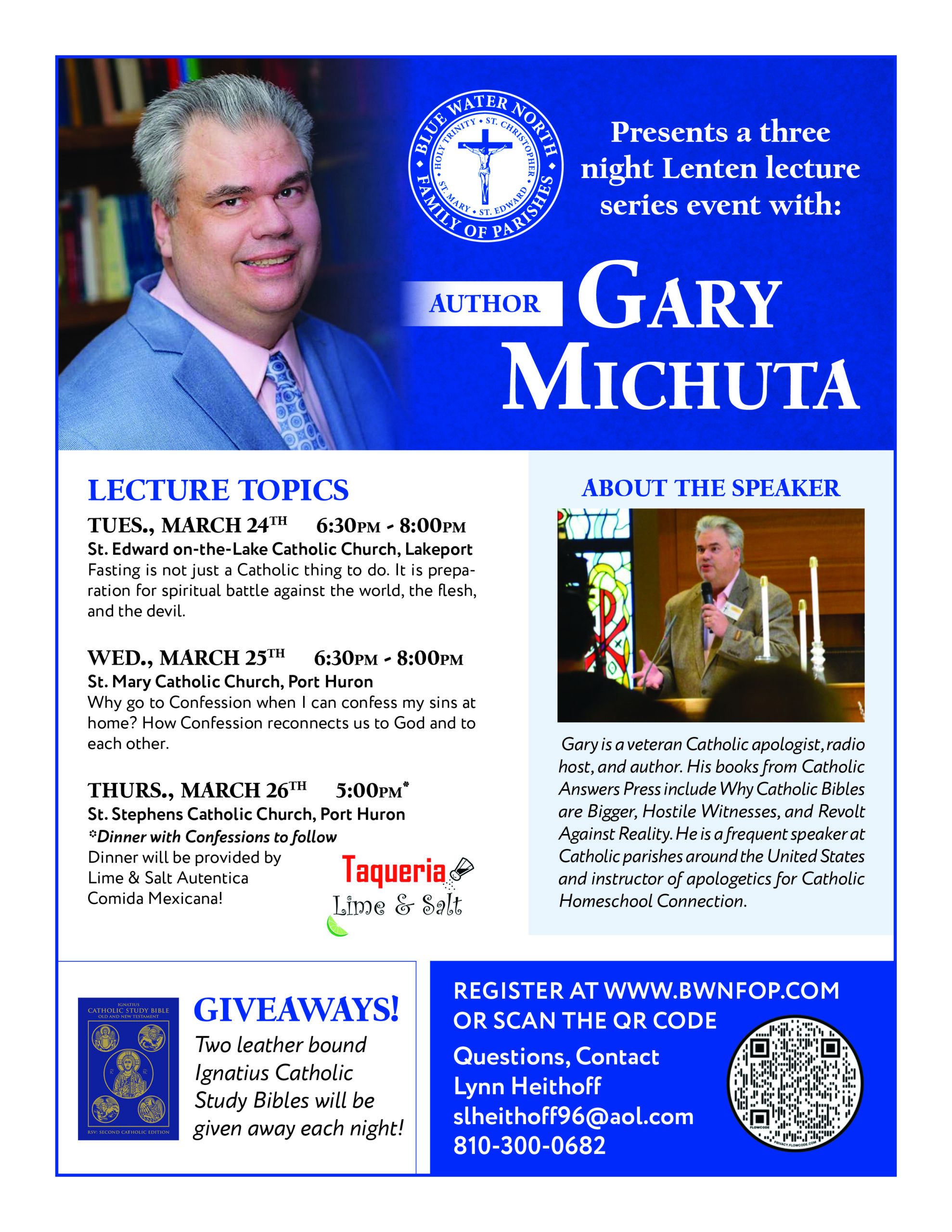 Blue Water North Family of Parishes presents a three night Lenten lecture series hosted by Gary Michuta, a veteran Catholic apologist, radio host, and author.